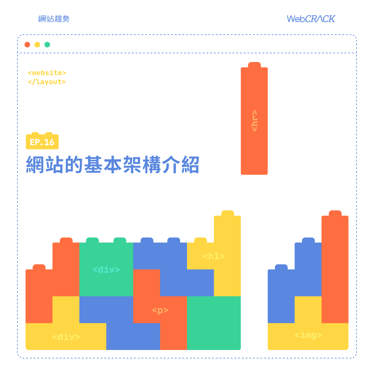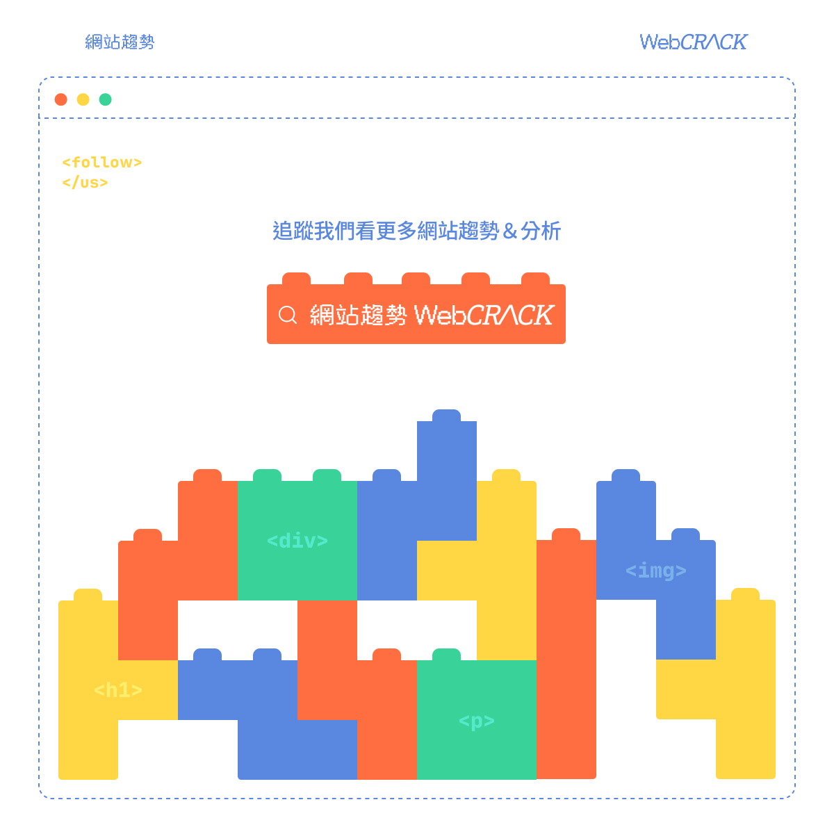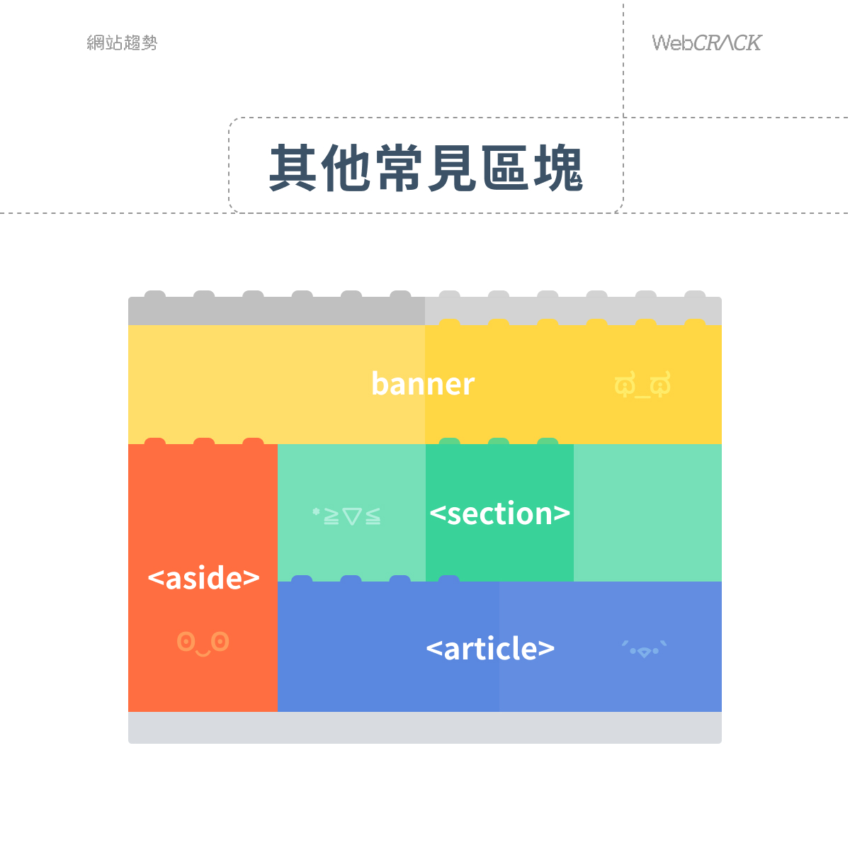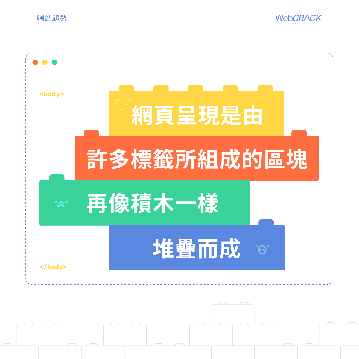 網頁呈現是由許多標籤所組成的區塊,再像疊積木一樣堆疊而成。