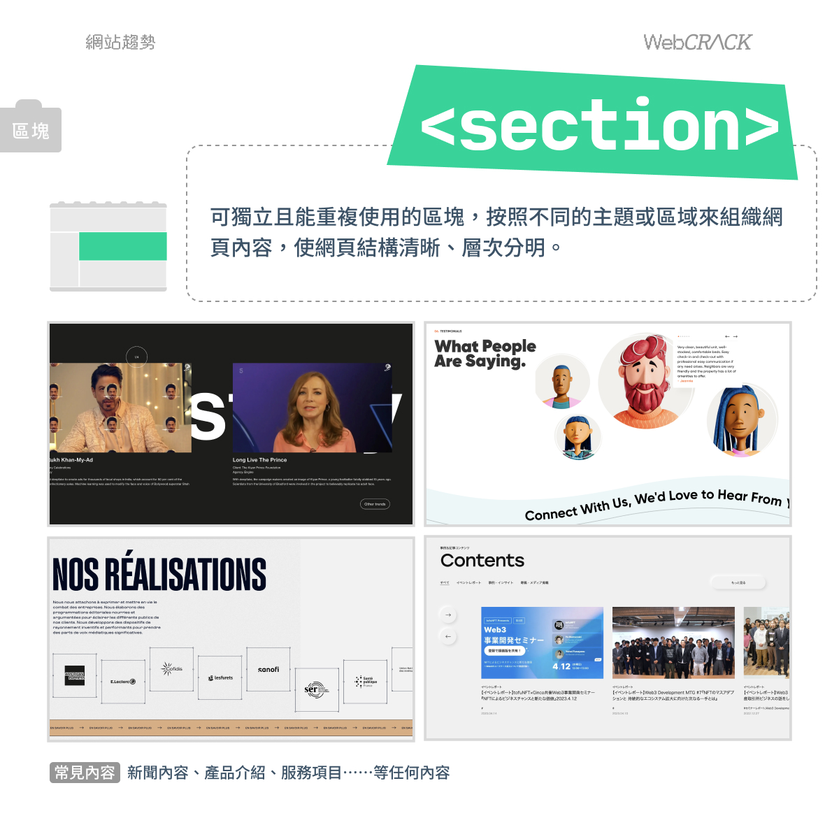 可獨立且重複使用的區塊,按照不同的主題或區域組織網頁內容,使網頁結構清晰、層次分明。