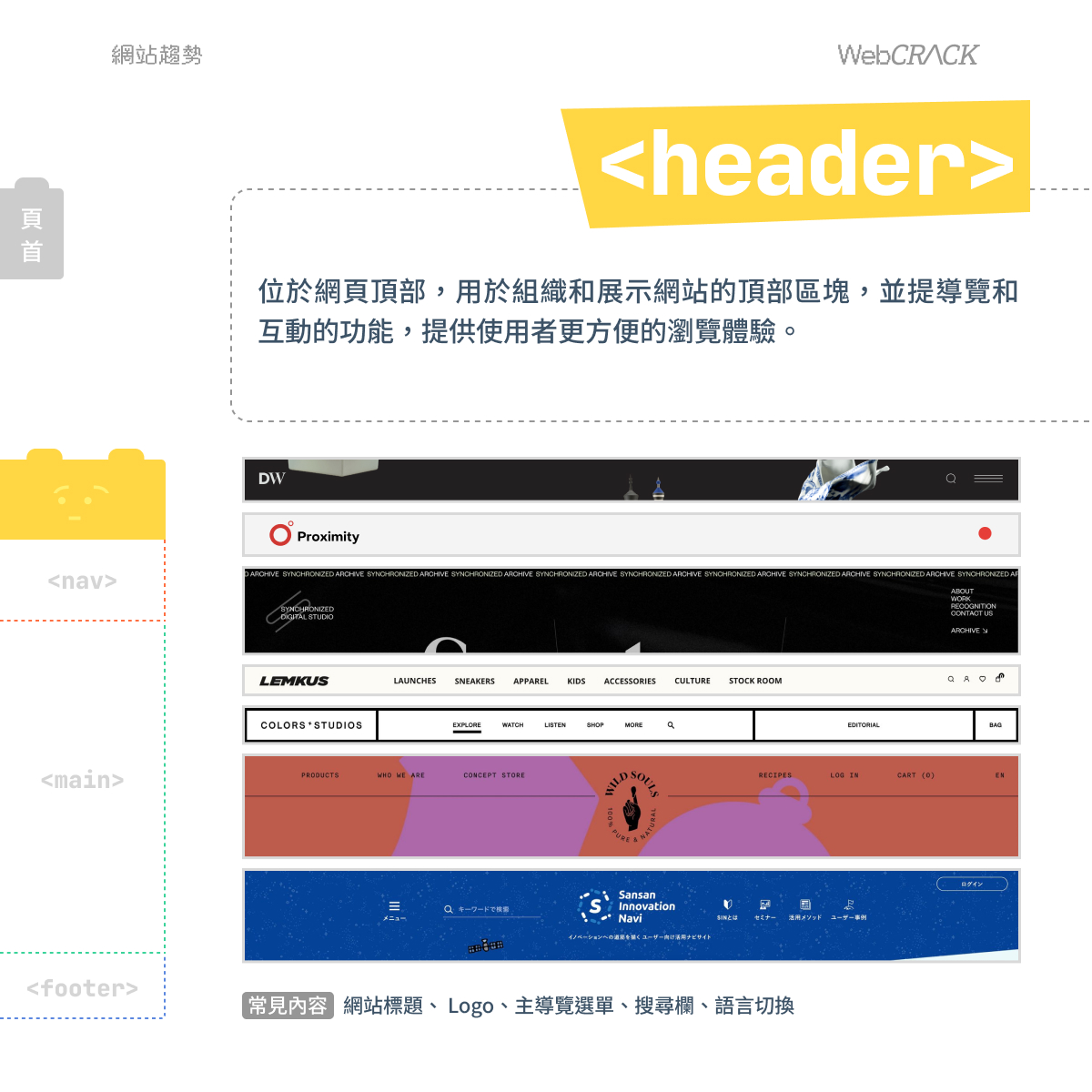 位於網頁頂部,用於組織和展示網站的頂部區塊,並提導覽和互動的功能,提供使用者更方便的瀏覽體驗。