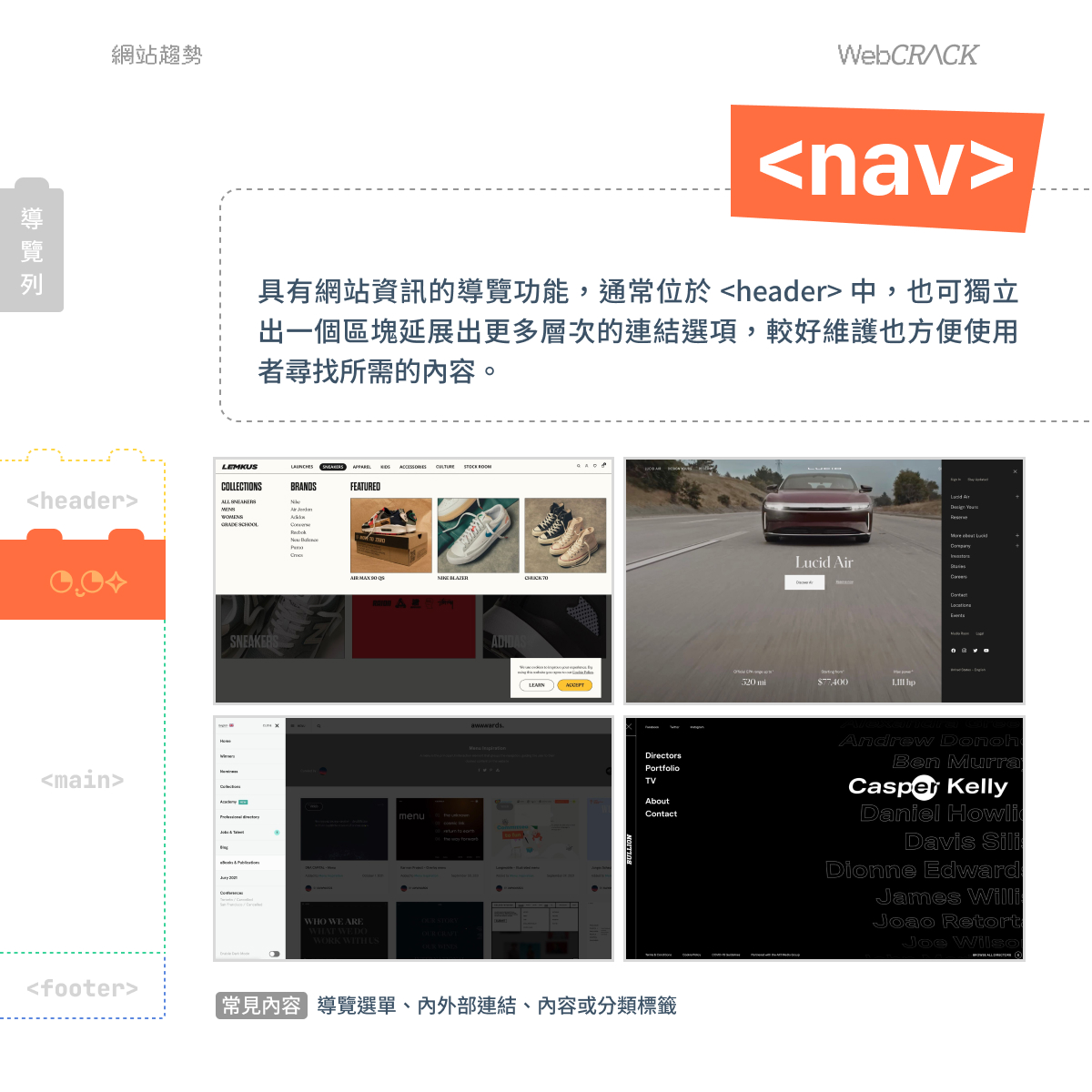 具有網站資訊的導覽功能,通常位於 <header> 中,也可獨立出一個區塊延展出更多層次的連結選項,較好維護也方便使用者尋找所需的內容。