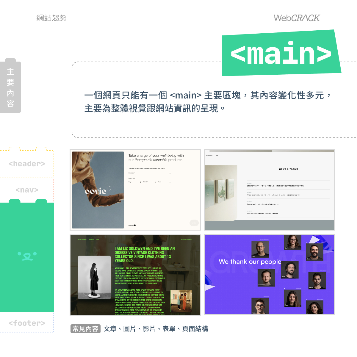 一個網頁只能有一個 < main > 主要區塊,包含網站的主要文章內容、頁面的結構元素,其內容變化性多元,用來展現網頁的獨特性,呈現整體視覺跟資訊。