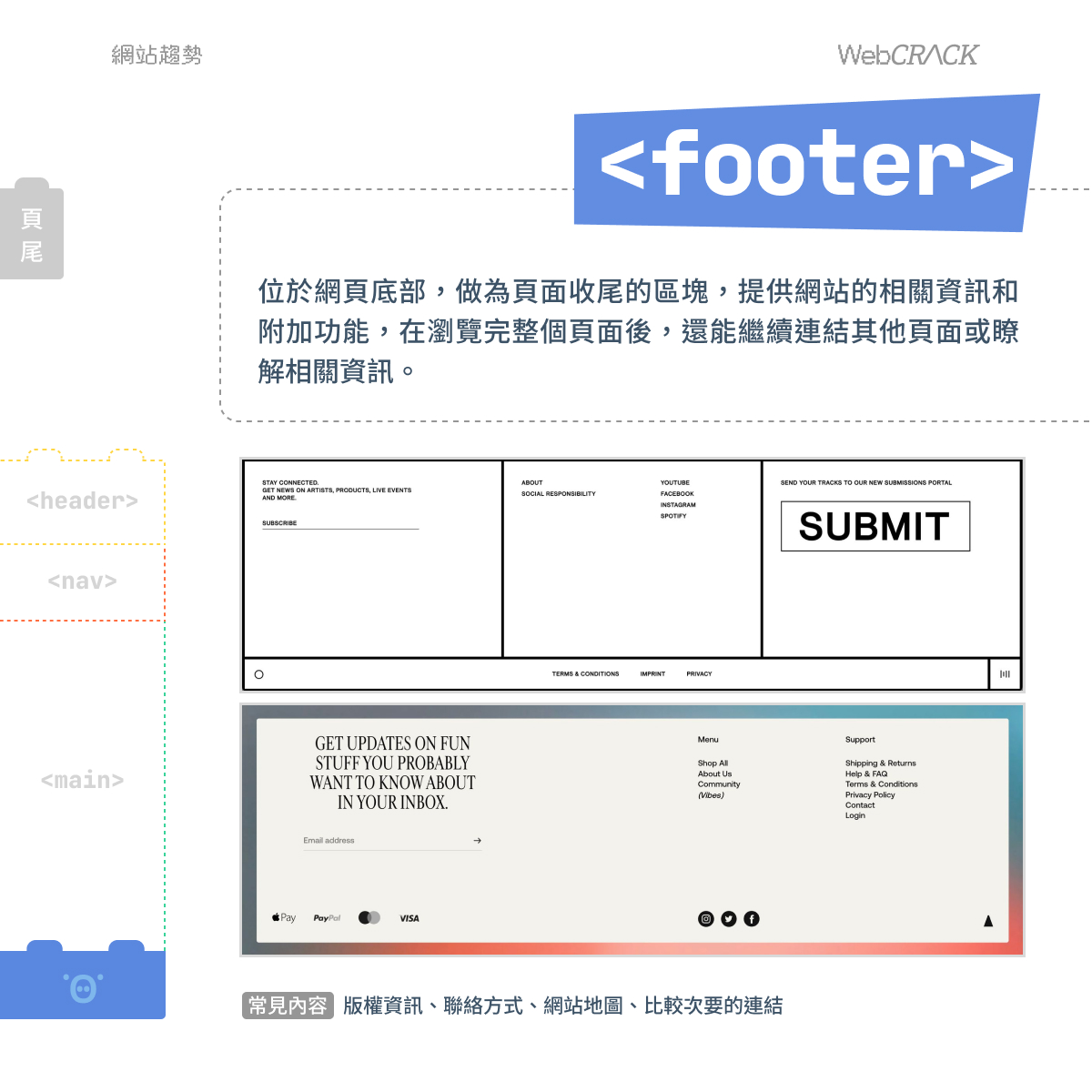 位於網頁底部,做為頁面收尾的區塊,提供網站的相關資訊和附加功能,在瀏覽完整個頁面後,還能繼續連結其他頁面或瞭解相關資訊。