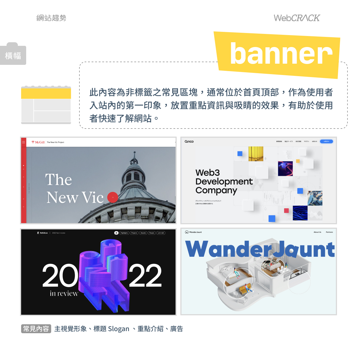 此內容為非標籤之常見區塊,通常位於首頁頂部,作為使用者入站內的第一印象,放置重點資訊與吸睛的效果,有助於使用者快速了解網站,進入狀況。