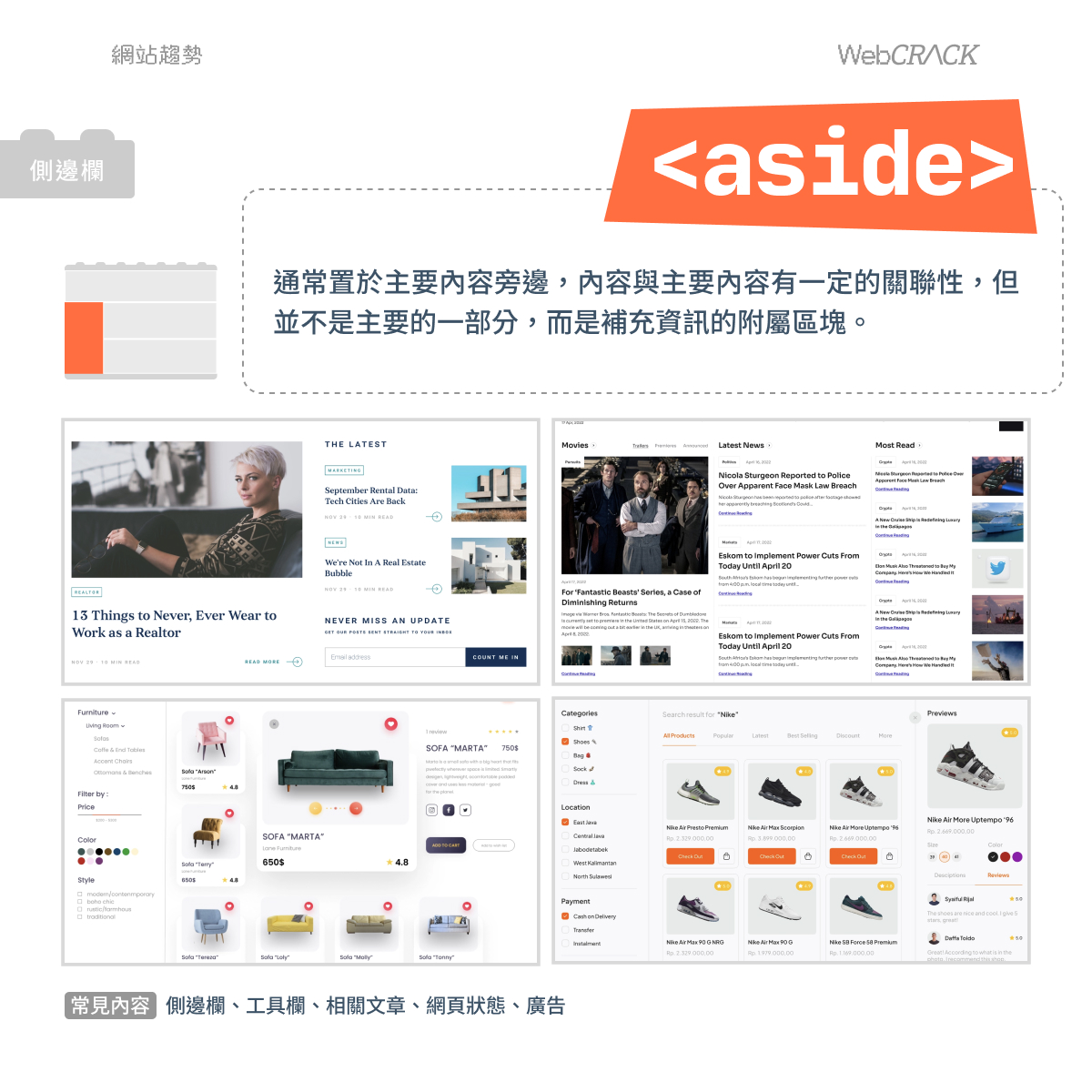 通常置於主要內容旁邊,內容與主要內容有一定的關聯性,但並不是主要的一部分,而是補充資訊的附屬區塊,有助於提供更完整和豐富的網頁內容。