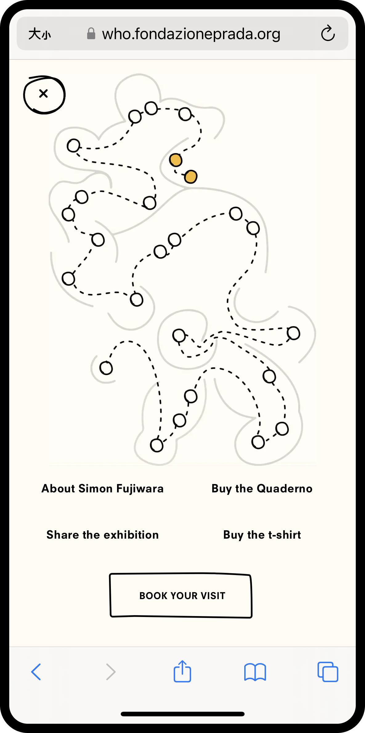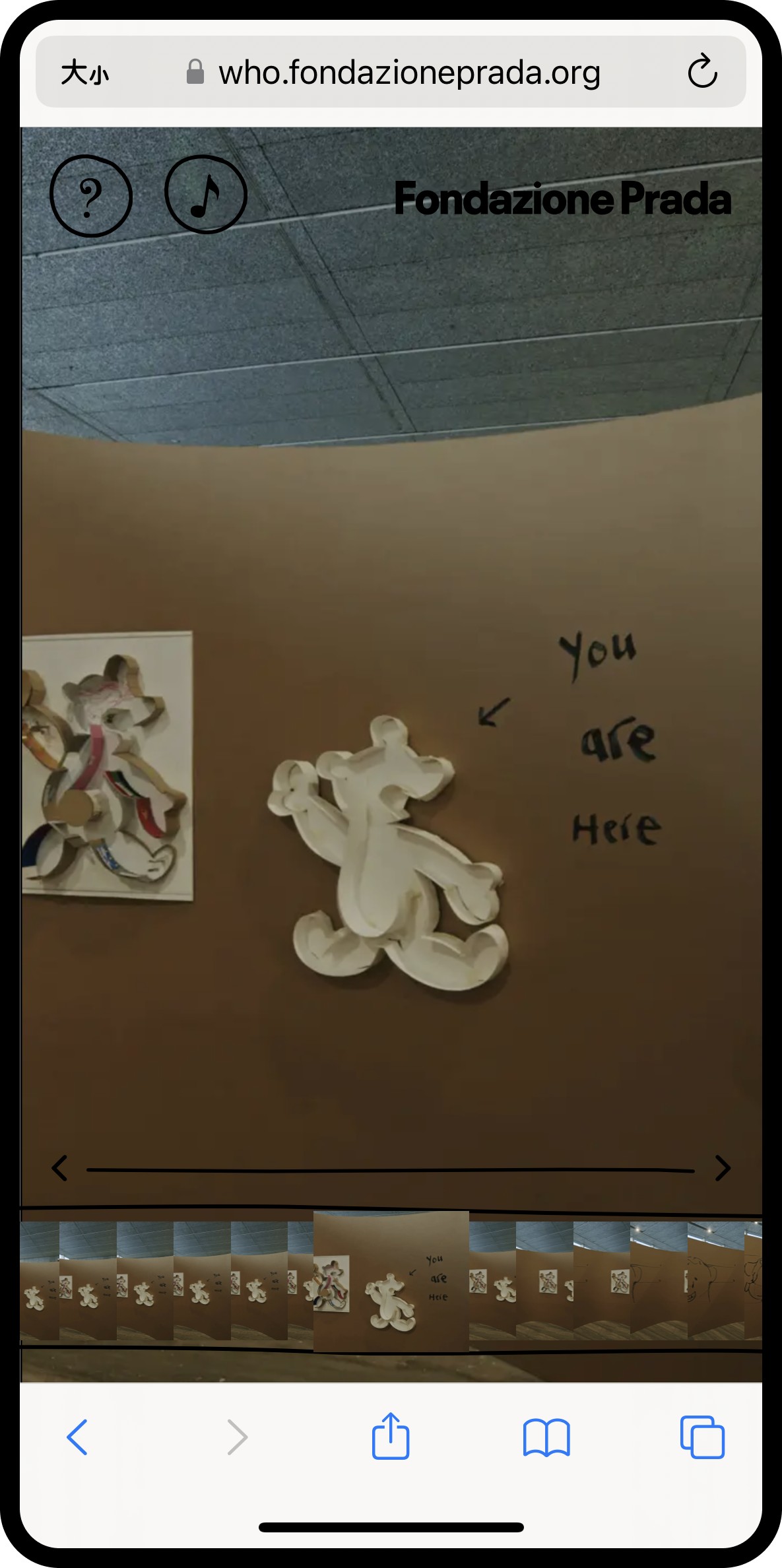 以行動裝置作為主要呈現方式,透過下方展覽影片的拖曳,每一幀的變換像是真的有路線指引一樣的在逛展,且在特定區域上會做 Highlight 指示可觀看更多,內容從錄像、圖像動畫、到展覽採訪都有,雖然是簡單的呈現方式,但在導覽上很有效的互動體驗。 - 線上展覽與互動導覽: