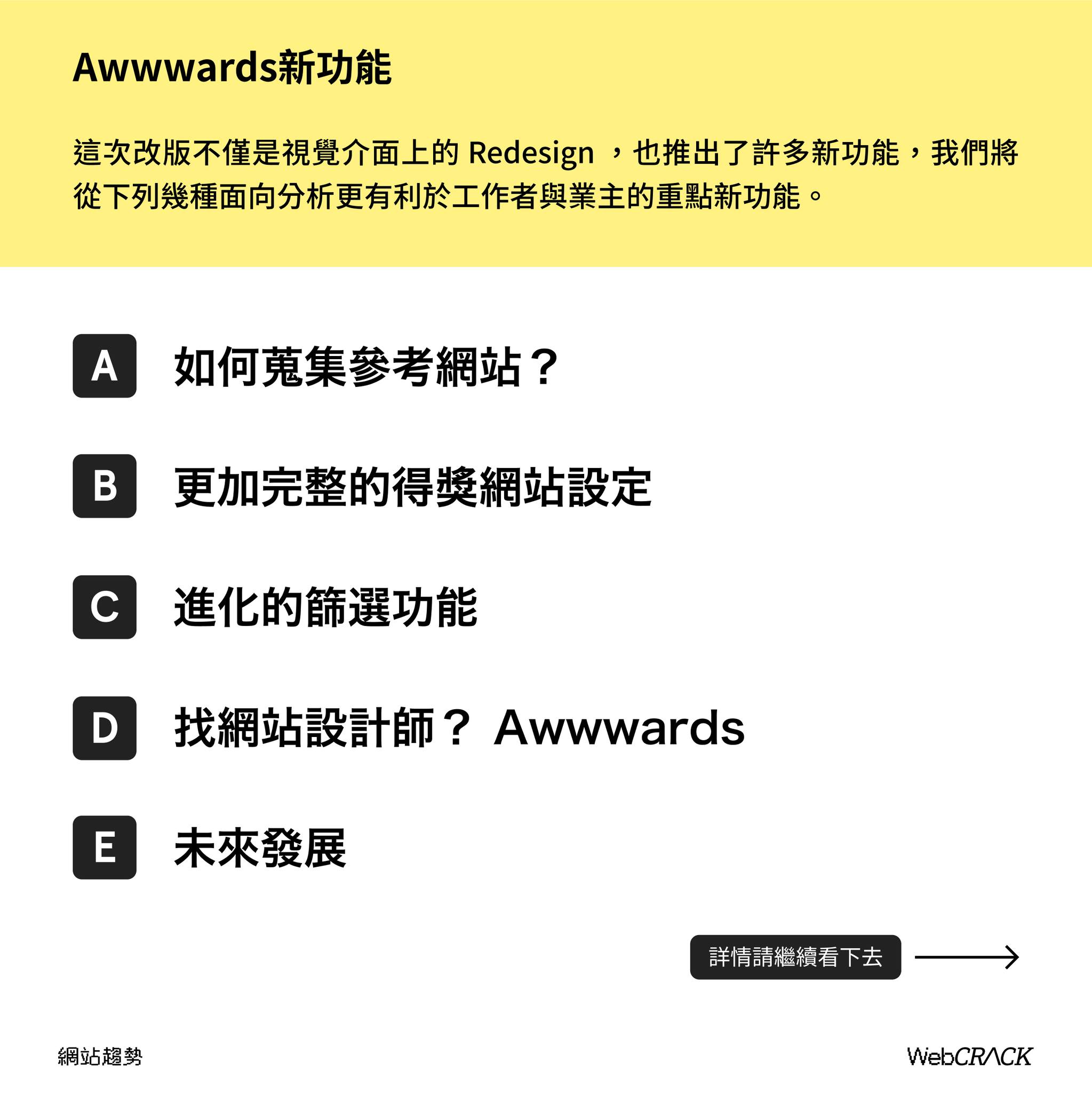 這次 Awwwards 大改版,最讓人不知所措的應該是變得漏漏長的首頁吧?在首頁也預告著這次的 Redesign 只是一系列新功能與工具的開端,讓人不禁對 Awwwards 的新方向感到既期待又不安啊~