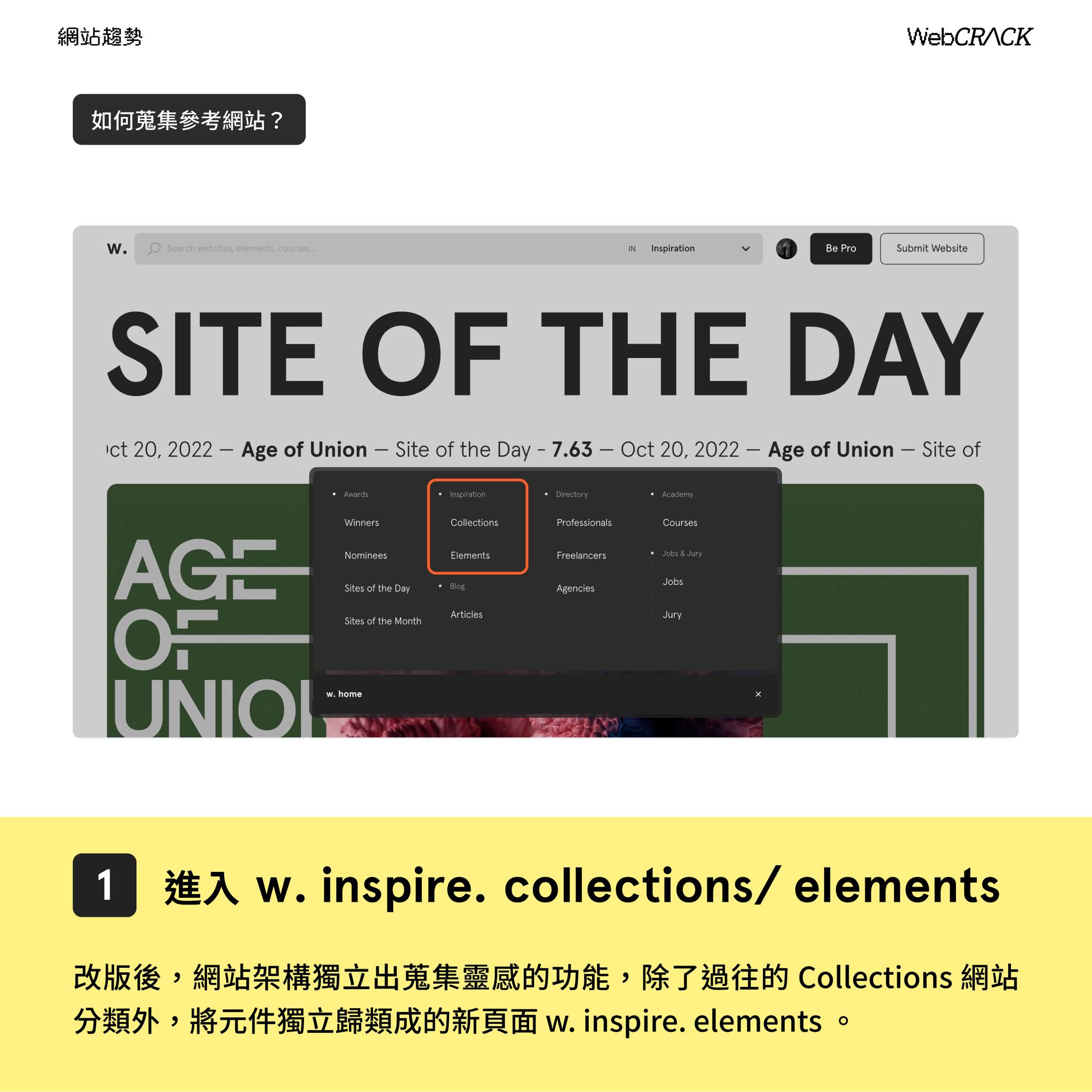 改版後,網站架構獨立出蒐集靈感的功能,除了過往的 Collections 網站分類外,將元件獨立歸類成的新頁面 w. inspire. elements 。