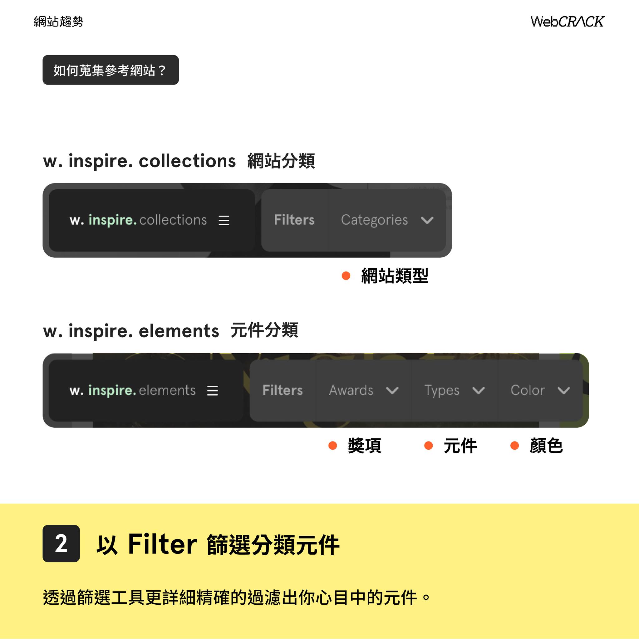 透過篩選工具更詳細精確的過濾出你心目中的元件,在 w. inspire. collections 可以篩選網站類型,在 w. inspire. elements 可以以獎項、元件、顏色細分。