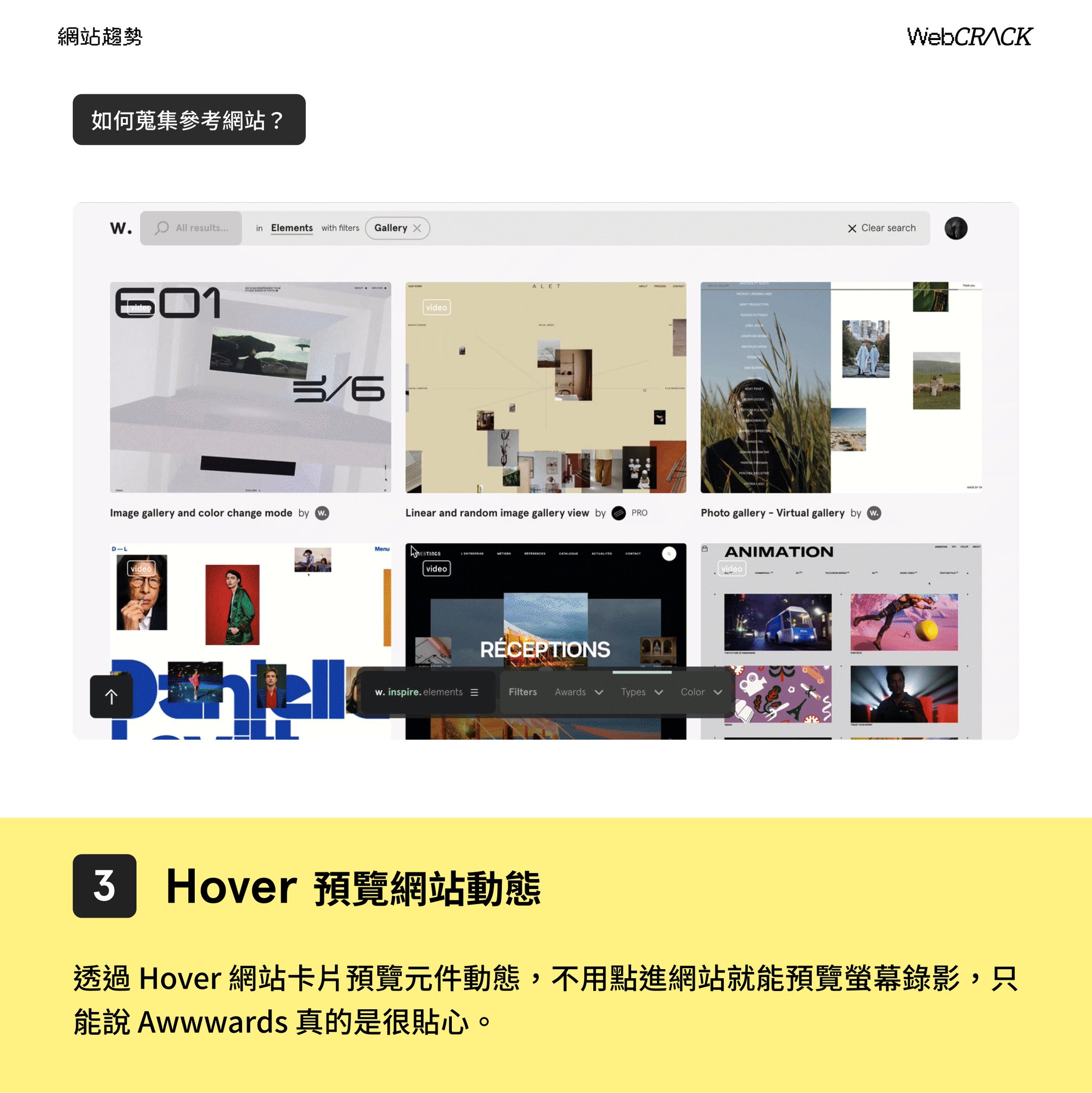 透過 Hover 網站卡片預覽元件動態,不用點進網站就能預覽螢幕錄影,只能說 Awwwards 真的是很貼心。