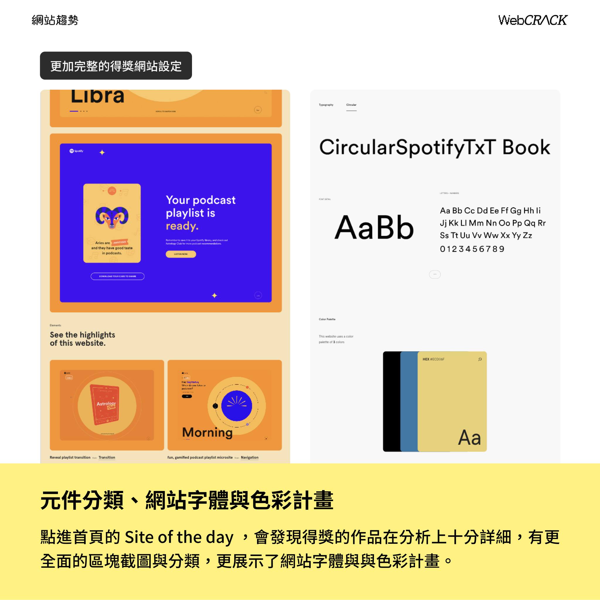 點進首頁的 Site of the day ,會發現得獎的作品在分析上十分詳細,有更全面的區塊截圖與分類,更展示了網站字體與與色彩計畫。