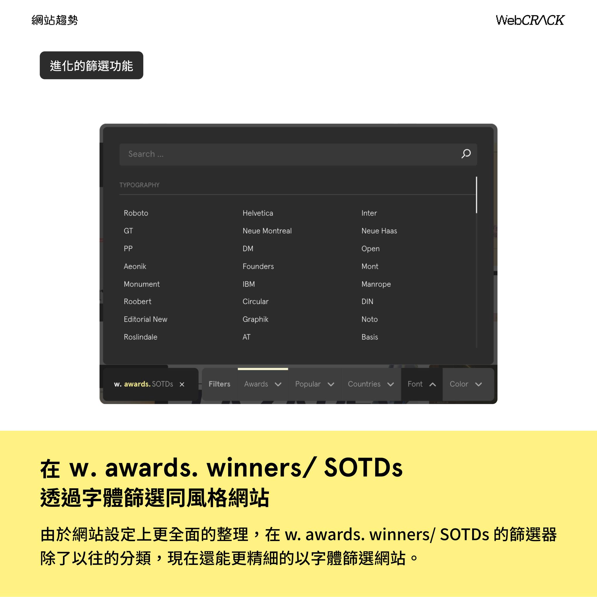 由於網站設定上更全面的整理,在 w. awards. winners/ SOTDs 的篩選器除了以往的分類,現在還能更精細的以字體篩選網站。
