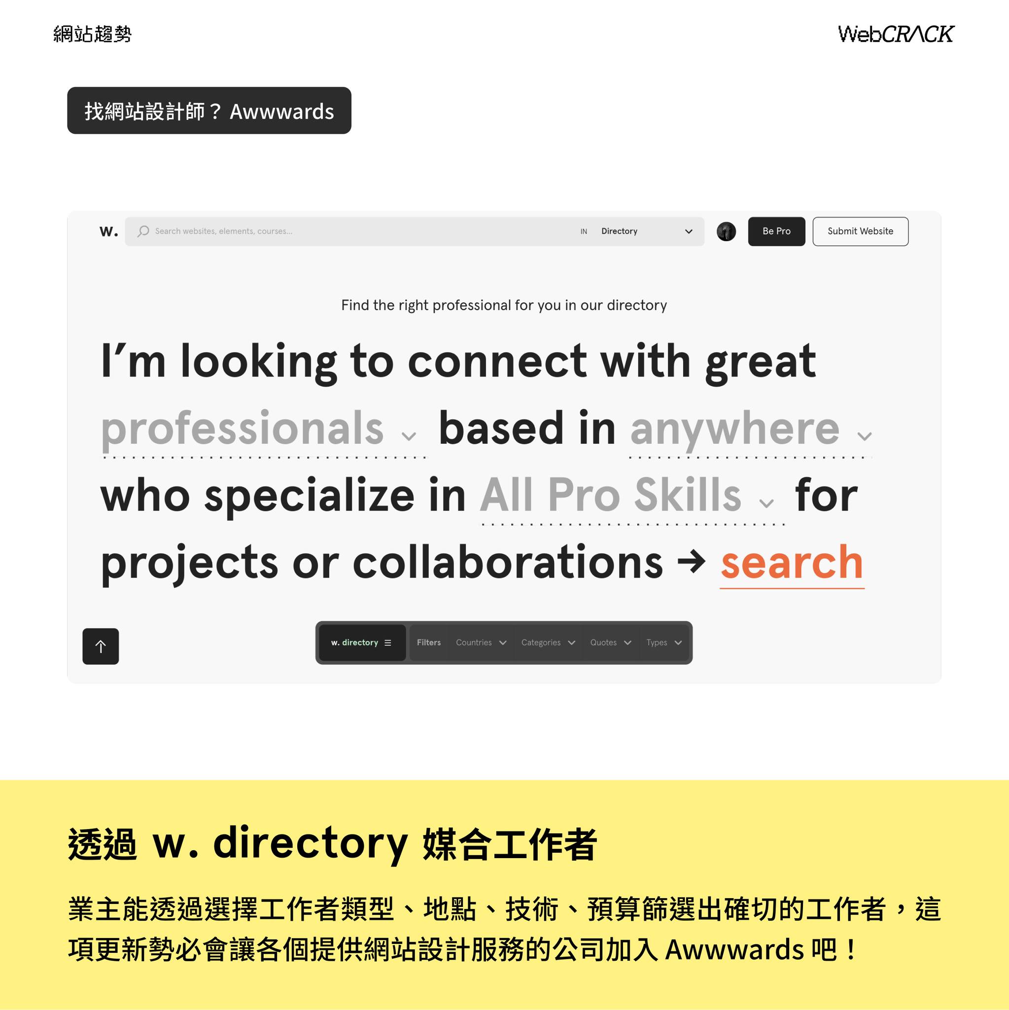 這次Awwwards的改版不只面向網站設計師,在 w. directory ,業主能透過選擇工作者類型、地點、技術、預算篩選出確切的工作者,這項更新勢必會讓各個提供網站設計服務的公司加入Awwwards吧