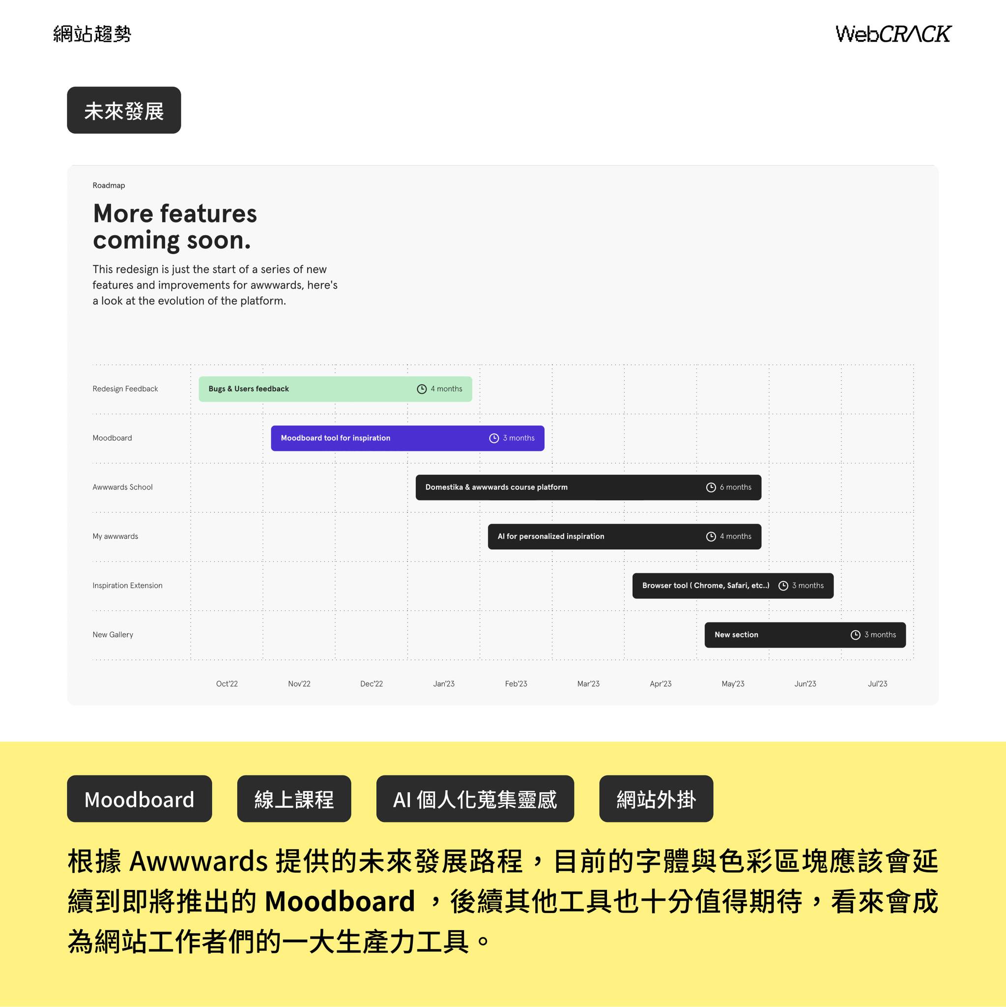 如同開頭所提,以上都是為了之後的新功能鋪路,當然導向他們最新的會員制度。而在未來發展上,目前的字體與色彩區塊應該會延續到後續的 #Moodboard工具 , 再來 Awwwards 也將推出 #線上課程,明年預計發展 #AI個人化的蒐集靈感工具,與 #網站外掛工具,除了在首頁顯示的後續功能外, #會員頁 也提到將來更完整的利於工作者方案,有興趣的同行們可以點進 Awwwards 看看。